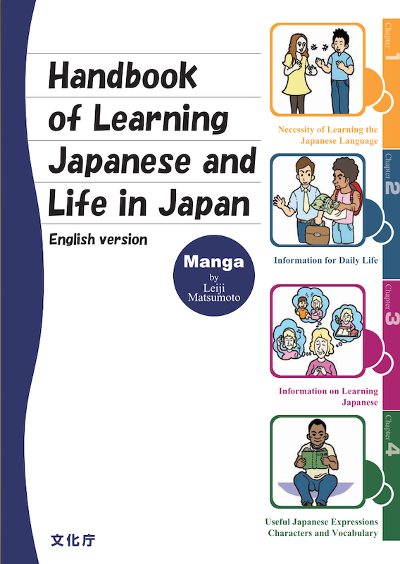 This handbook highlights the necessity of studying Japanese, and contains information related to daily life as well as introductory Japanese phrases. It is available in five languages (Korean, Chinese, Portuguese, Spanish and English) printed alongside in Japanese.