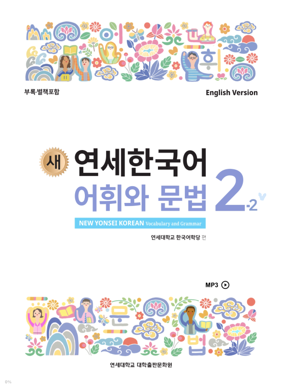 This newly published New Yonsei Korean Language Series is comprised of six levels with each level consisting of textbooks for Vocabulary & Grammar, Speaking & Writing, and Listening & Reading. The Vocabulary & Grammar textbook is organized into lessons that help the learner understand and use the most essential vocabulary and grammar forms according to each proficiency level. The Speaking & Writing textbook is organized by themes with speaking and writing activities to help the learner gain the necessary skills of expression for smooth communication.